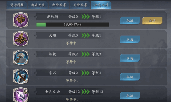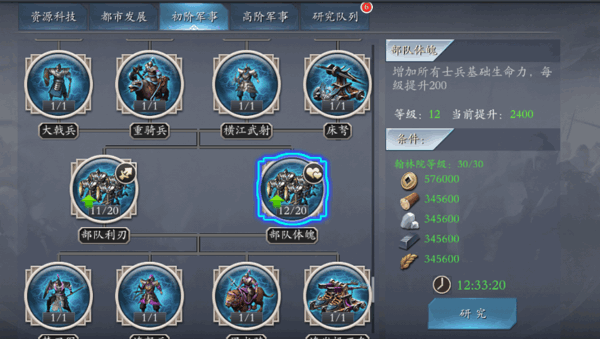 包含步、弓、骑、器械4个兵种的攻击、血量以及更高级的命中、闪避、暴击、韧性等等一共12个军事类型的科技,主要快速提升玩家的军事实力,对于喜欢战争的玩家则可以优先发展这一个类型的科技。