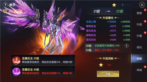 升级是最常用也是最普遍的一种养成方法,每一个翼灵升级以后都可以提升属性,每一个翼灵都有自己偏重的属性,这一点玩家可以直接在翼灵升级之后提升的属性就可以看出。比如橙色翼灵天驱,它更强调技能攻击以及混沌属性。另一个橙色翼灵神核则强调防御属性的提升。因此看到翼灵升级属性,玩家就需要根据自己的需求来进行针对性培养。