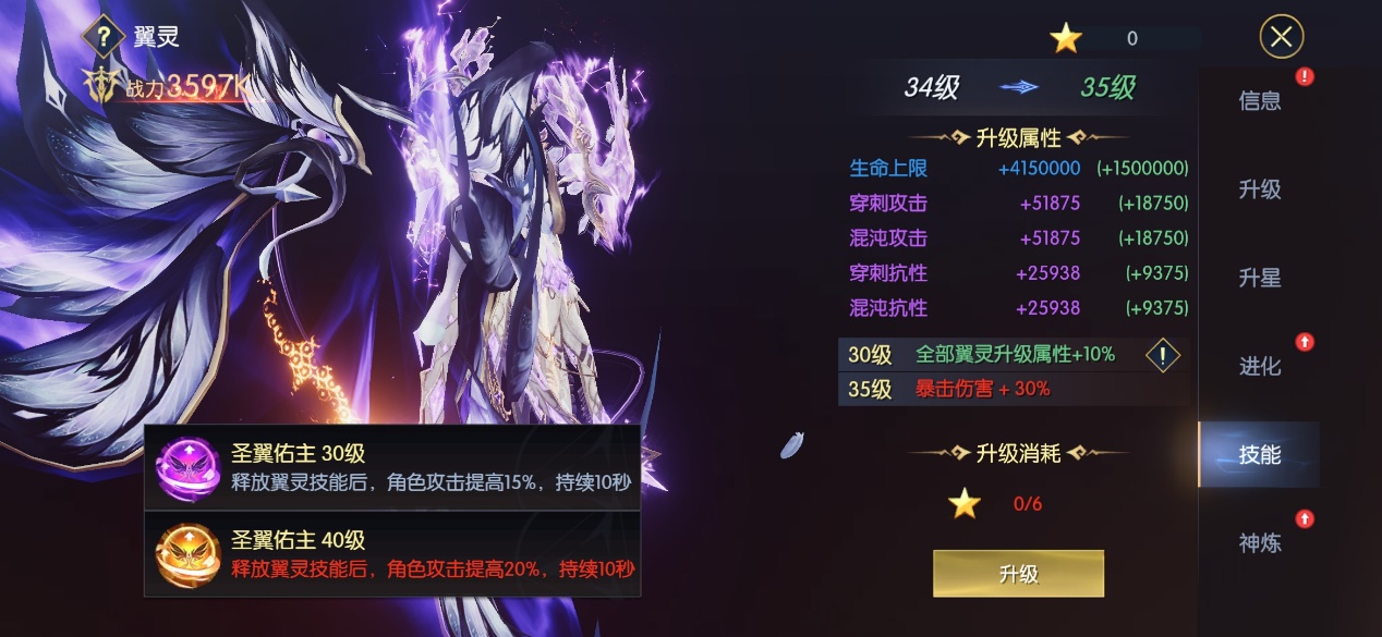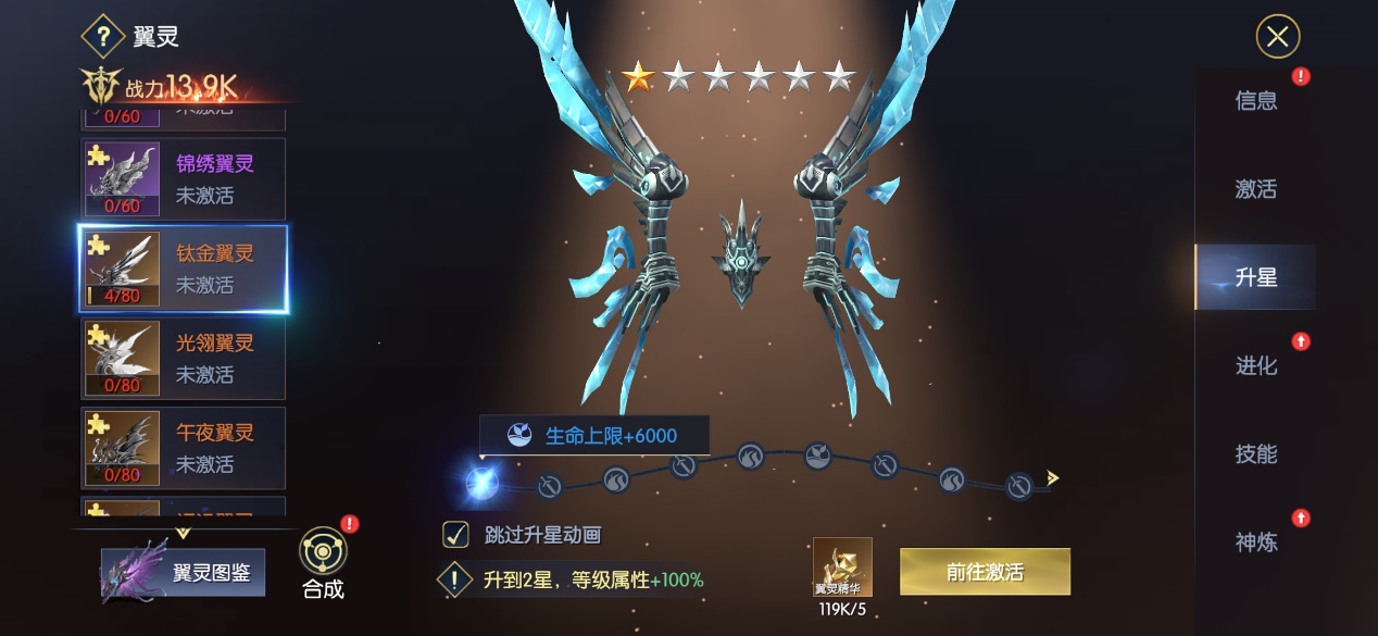 升星是翼灵提升战力和变化外观的系统,每隔一定星级,外形和特效也会强化一个档次。