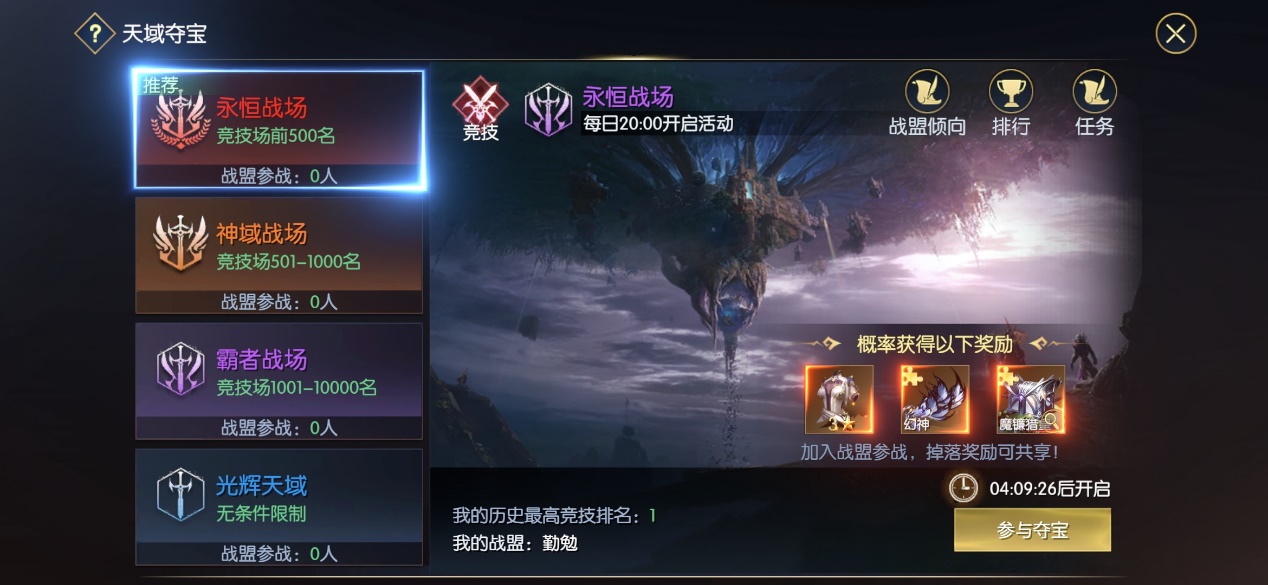 另一种是参加天域夺宝玩法-只有战盟玩家才能参加的战场模式。每日晚上8点开启,除了基础积分奖励,在战场上找到宝箱、击败精英怪或拿到精英怪的最后一击就有概率直接获得钻石、三星传说装备、和传说幻神翼灵碎片等奖励,最后大战结束,也有战绩奖励。