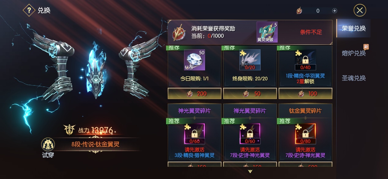 荣誉兑换商店中翼灵有购买限制,需要先购买前一级品质的翼灵解锁并升到一定去强度后才能购买下一级的翼灵。受限于这机制,建议玩家先不要兑换翼灵,反正前期兑换也是一个碎片一买,无法速通战力,不如将荣誉积攒起来。