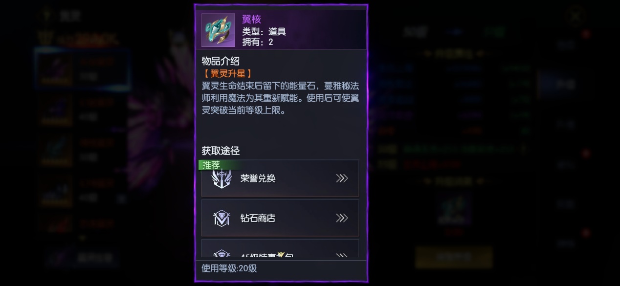 升级翼灵需要灵羽和翼核,灵羽给翼灵提供经验,而翼核则可以负责突破翼灵的等级上限。