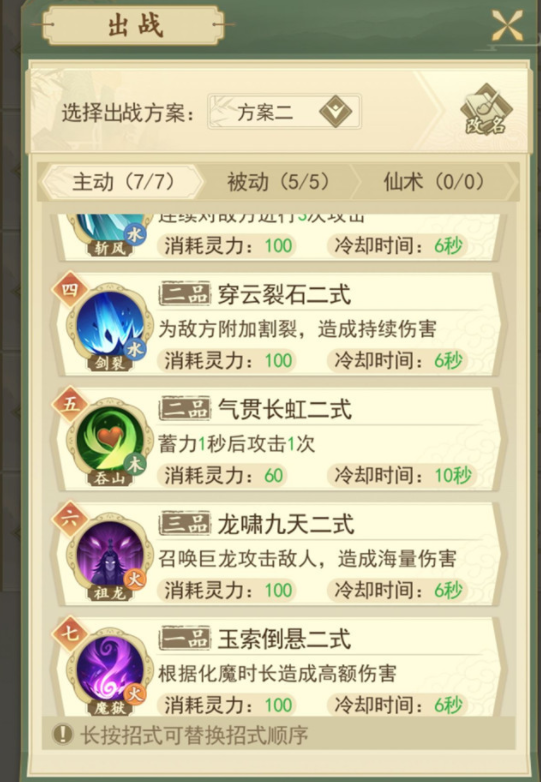 主动招式可以按照顺序搭配龙啸九天二式、韦陀百炼二式、气贯长虹二式、千年尤醉三式、魔入幽冥二式和天蚕离魂二式,而这么搭配以后,玩家们可以利用气贯长虹二式来巧妙的卡时间,这样就可以把笑虎的岚风斩月打断。
