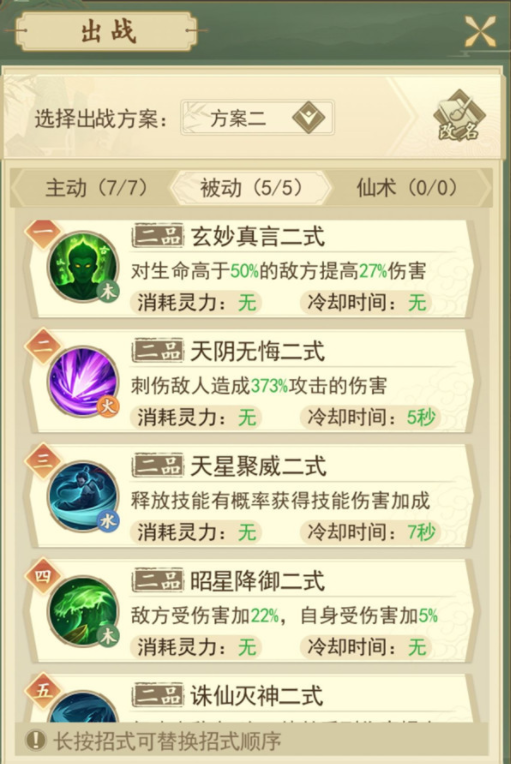 被动招式也可以按照顺序搭配诛仙灭神二式、天阴无悔二式和兴云回转二式,其中诛仙灭神二式可以在攻击笑虎3次以后加重伤害,天阴无悔二式可以在攻击笑虎以后造成373%的攻击伤害,兴云回转二式可以在给笑虎造成伤害的同时,有一定的机率给自身回复相当于笑虎损失生命95%的生命值。