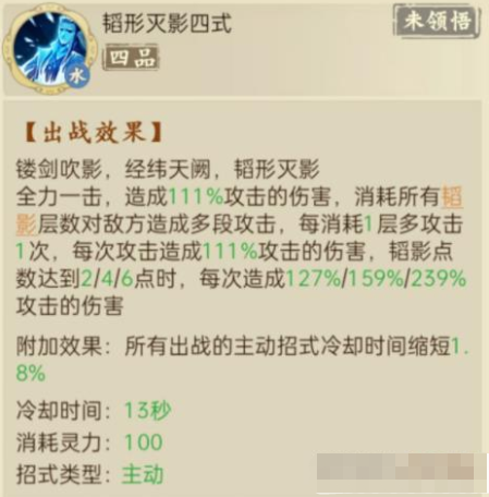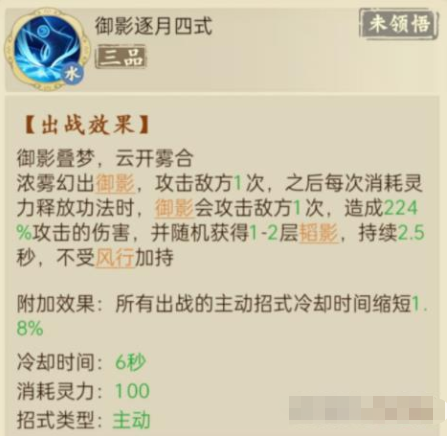 缺点就是CD偏长一轮战斗只有两次释放。招式踏影无痕也是属于滔影系里面的,但是没有使用它的必要。滔形影灭的CD是13秒,第一次释放由于御影逐月的天赋,滔影是可以叠到4-6层。