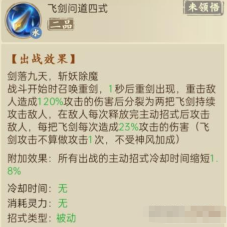 前期开局过渡的输出型被动,伤害比较刮痧,但是它全程持续不间断,能刮一整局的痧总伤在前期也不算低了。开局筑基后期五阶6元境界礼包里面的问剑经可参阅,一步到位后续没有品级提升。