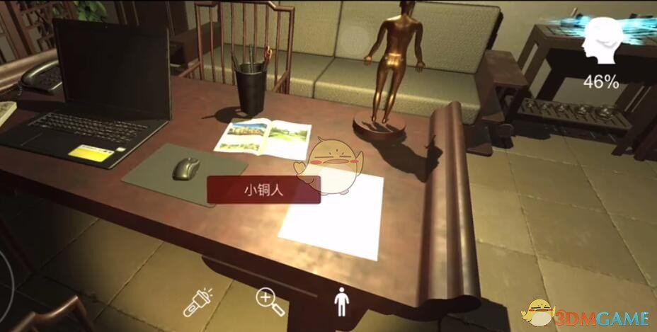 位置:在大厅放笔记本电脑的桌子上可以找到,小铜人这个线索比较明显好找到。