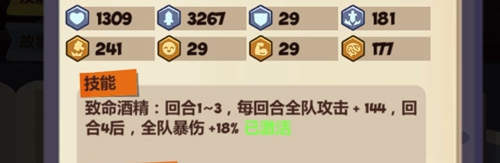 致命酒精:回合1~3,每回合全队攻击+216,回合4后,全队爆伤+26%。