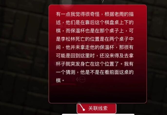 有一点我觉得很奇怪,根据老周的描述,他们是在靠后这个棋盘桌上下的棋,而保温杯也是在那个桌子上,可是李松林死亡的位置是在两个桌子中间,他并未拿走他的保温杯,那很有可能是回到这里时,还没来得及去拿杯子就突发身亡在这个位置了。我有一个猜测,他是不是在看前面这桌的棋。