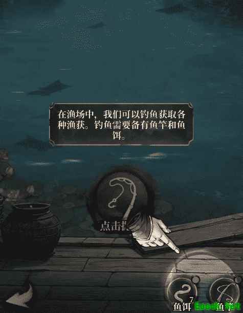 第一步:在渔场中,我们可以钓鱼获取各种渔获,钓鱼需要备有鱼竿和鱼饵。点击右下角选择鱼饵和鱼竿。