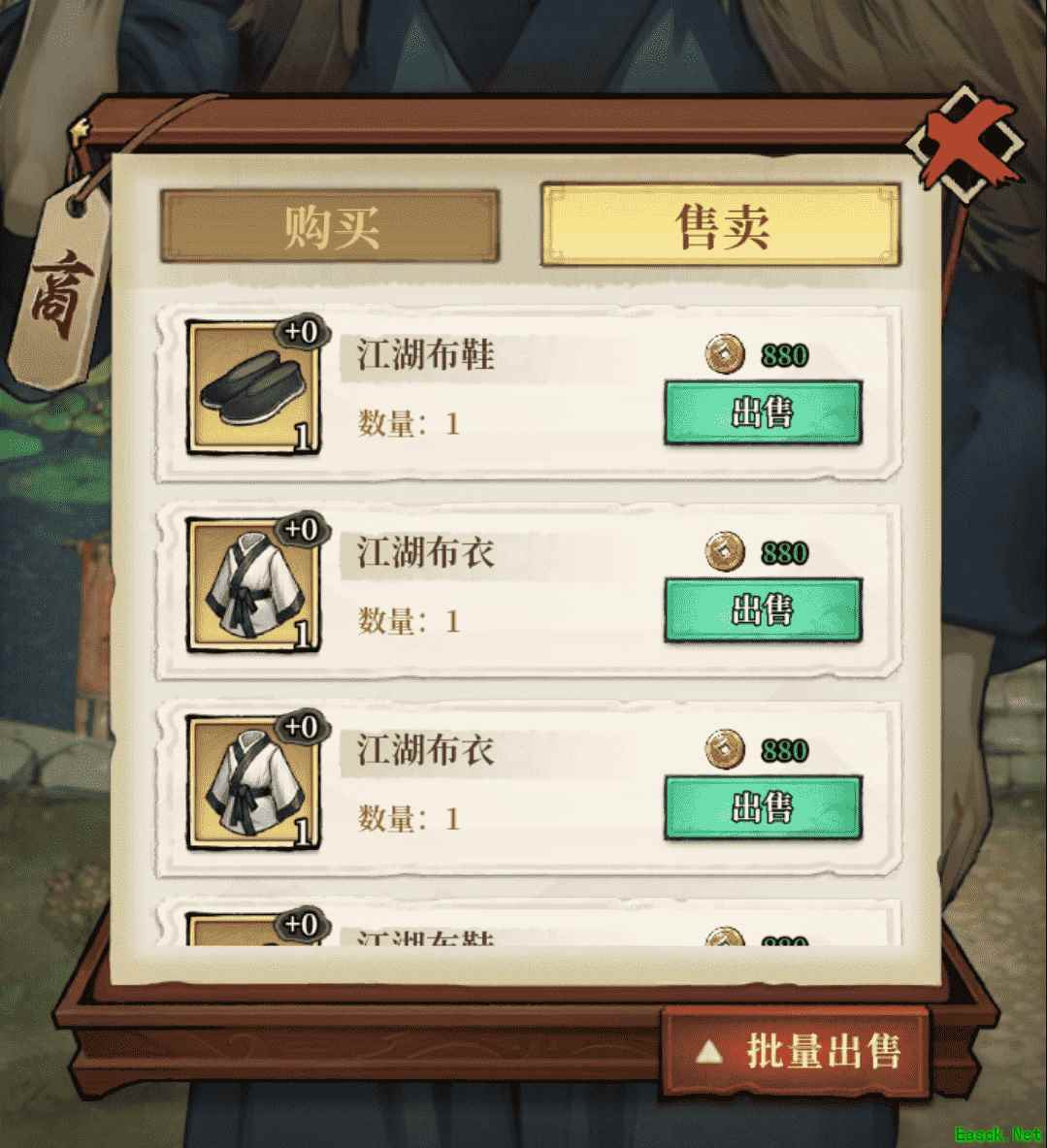 河边老翁除了可以找他购买鱼饵和鱼竿外,还可以向他出售防具和武器,换取铜币