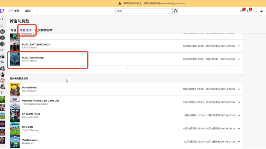 1、进入平台并绑定krafton蓝洞账号。接着在twitch平台进入掉宝与奖励页面,找到有drops标识的播间。
