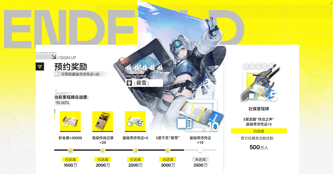 官方社媒关注数达到500万,可获得5星武器“终点之声”、基础寻访凭证x5