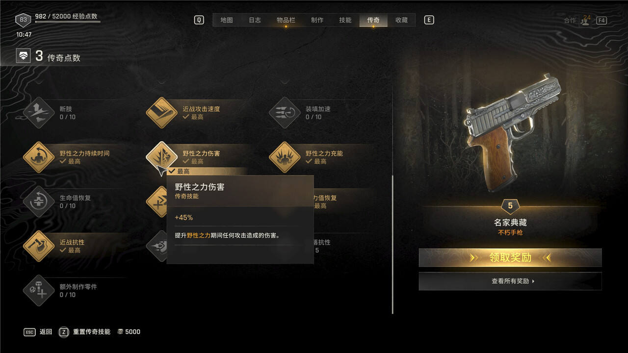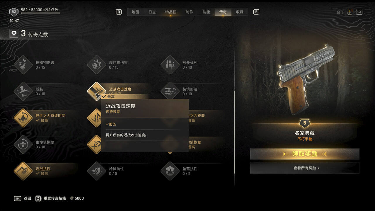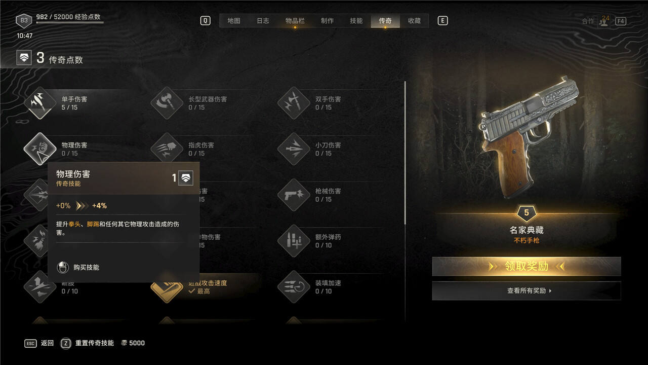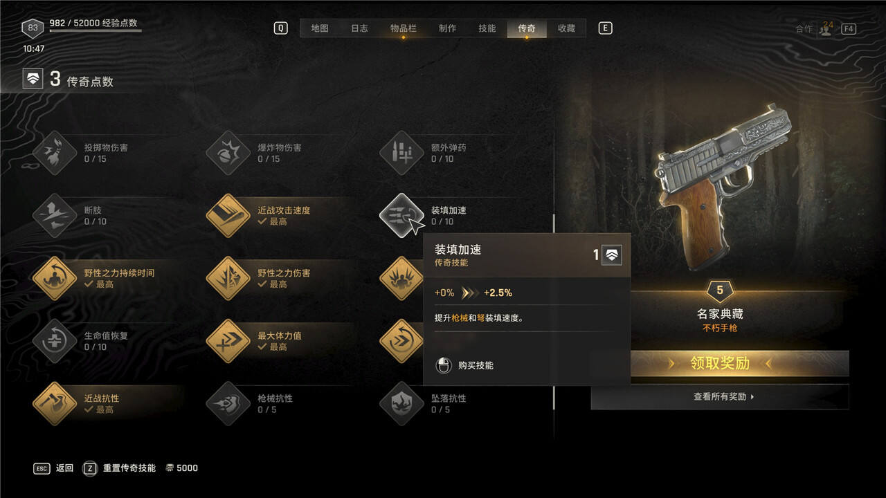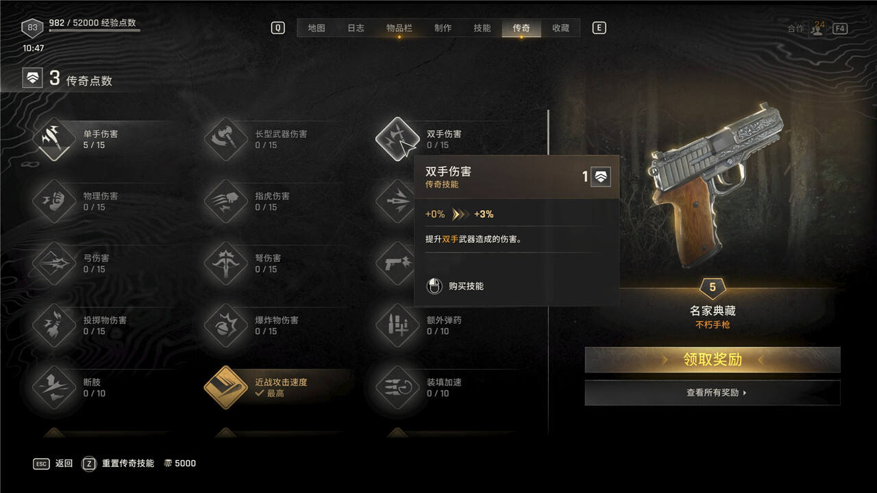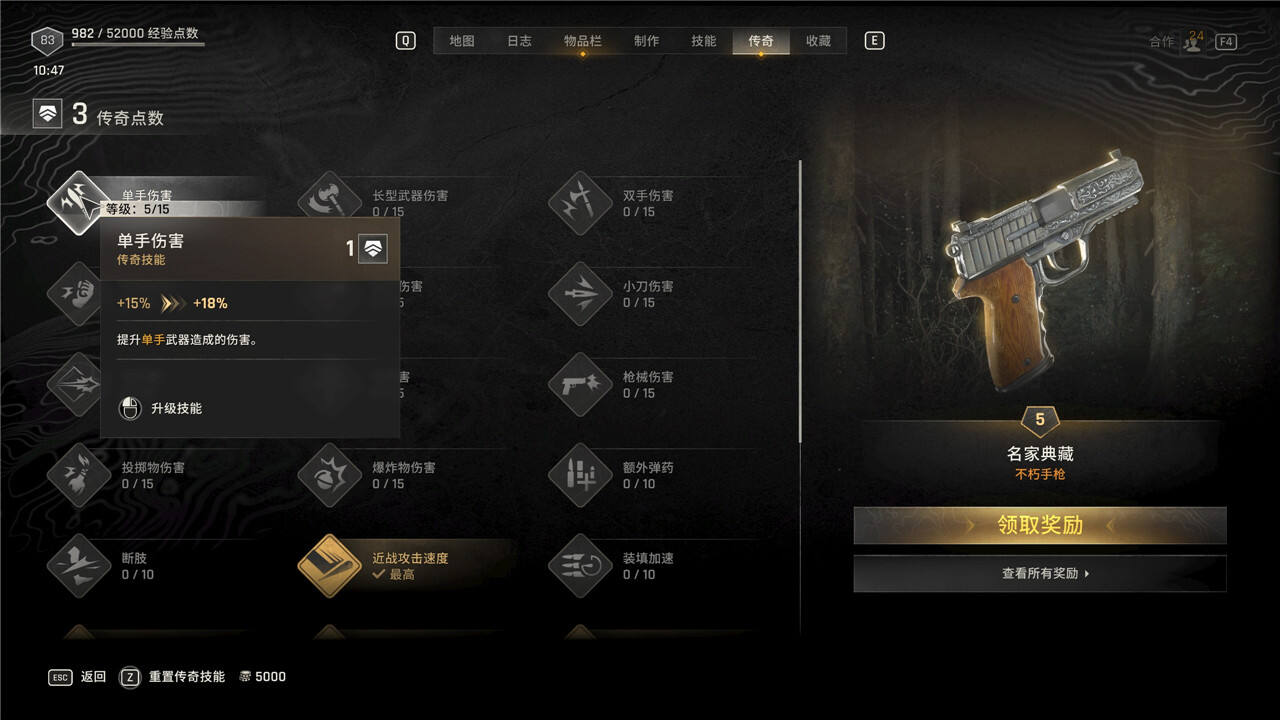 传奇技能可以随时花费5000块进行重置,但是重置后每级需要手动重新升级。