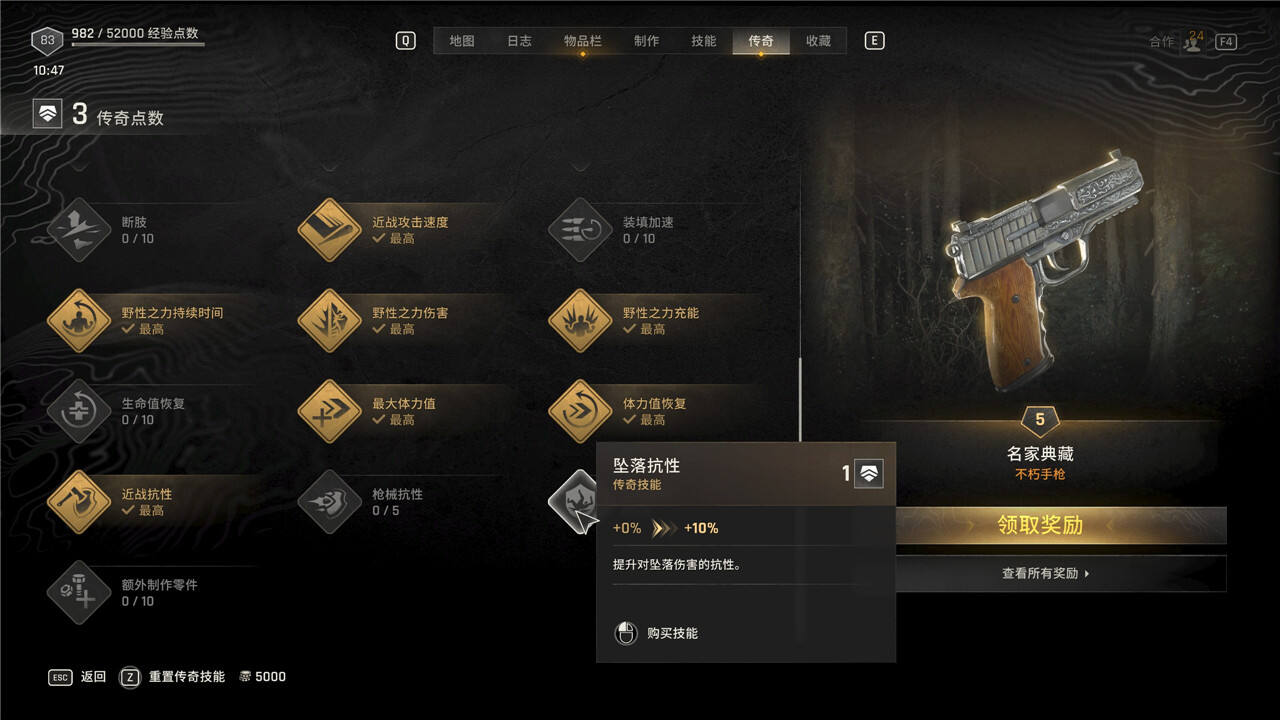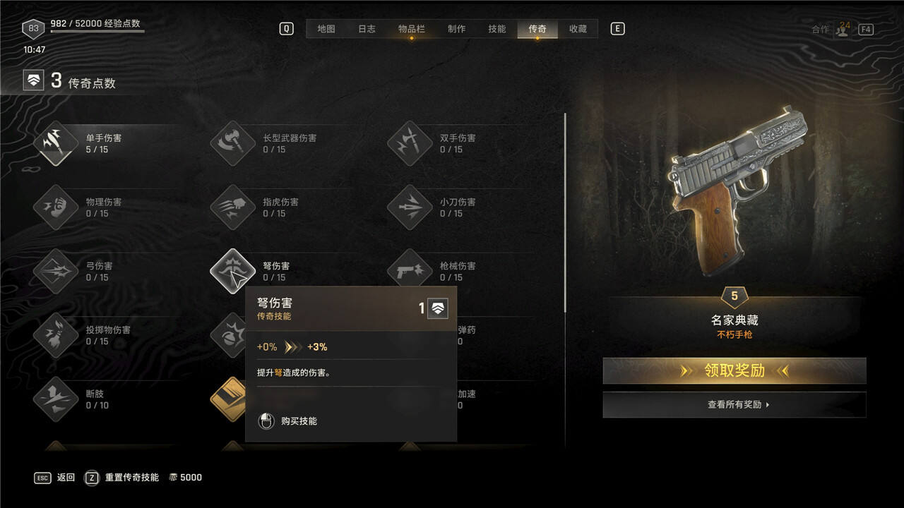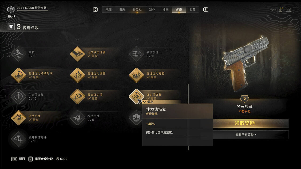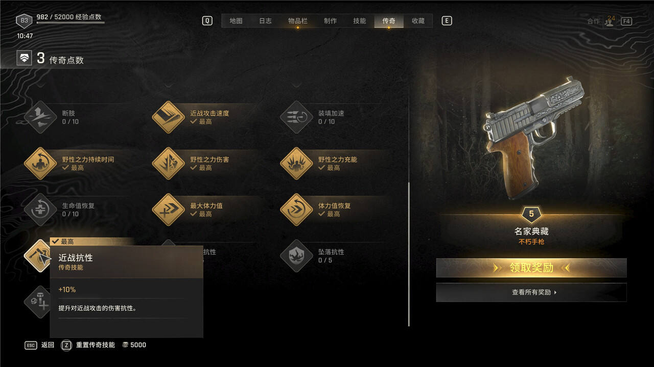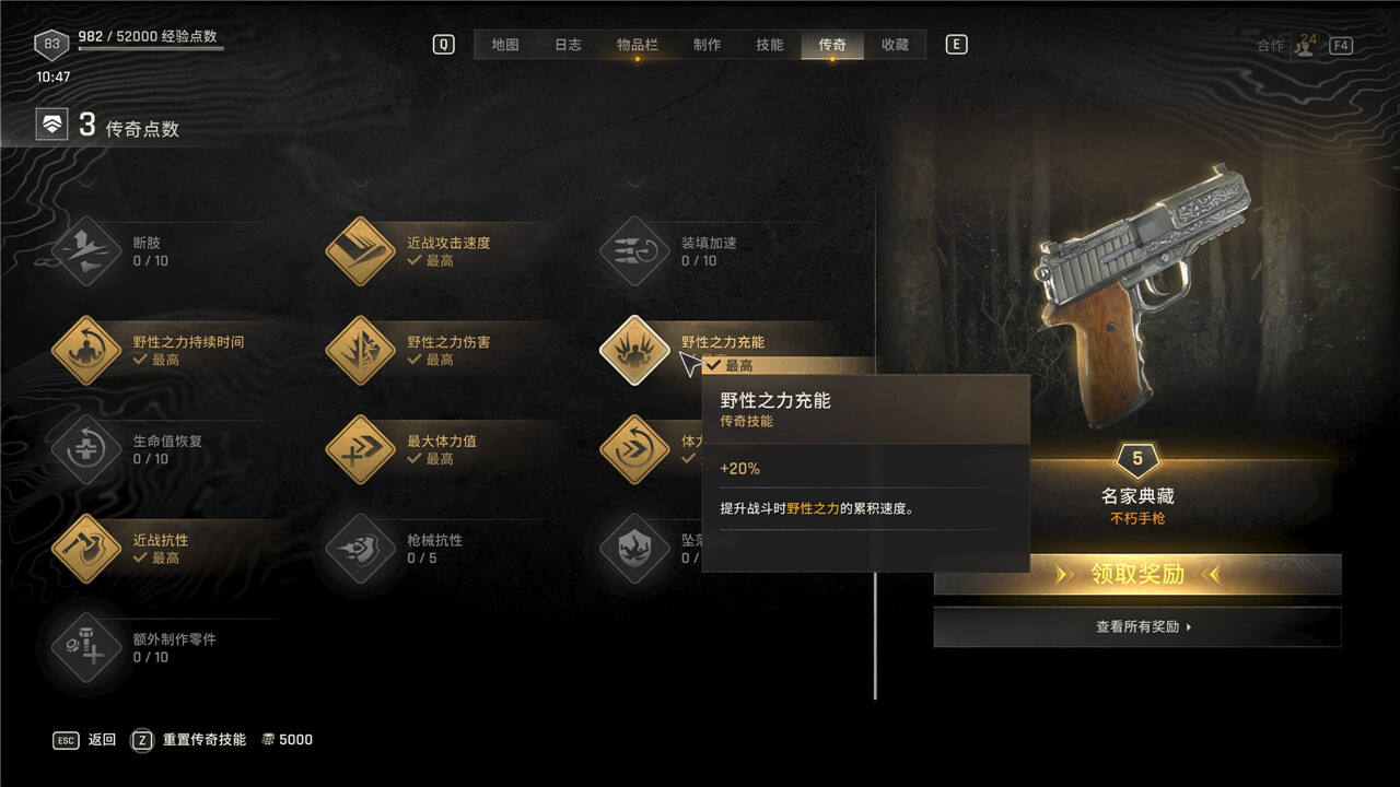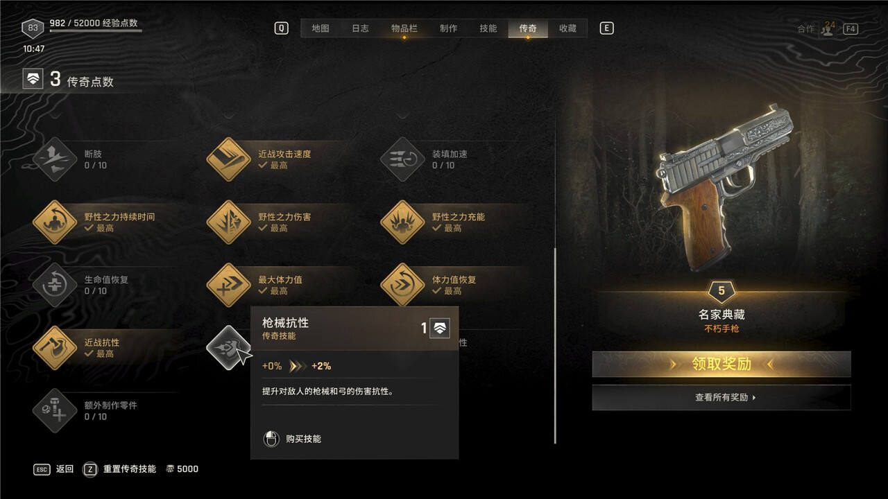 传奇技能可以随时花费5000块进行重置,但是重置后每级需要手动重新升级。
