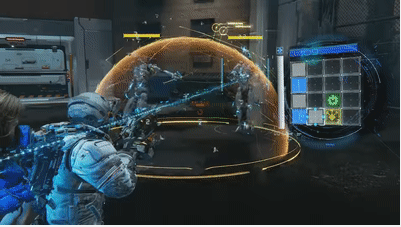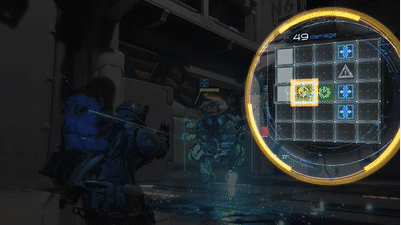 机器人敌人均装备了强化的装甲。需操作侵入矩阵才可强制解除它们的装甲,移动光标,用一笔画的感觉连至绿色结点(终点)。此时,攻击敌人露出的弱点即可大幅提升伤害。