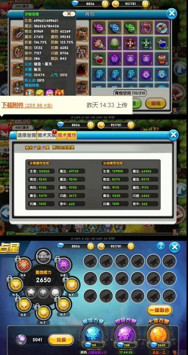 关于战力,骑术点的比较高,开始3阶以前看不出效果,后面加的真多,不过耗费的钻石也真吓人。6-7进阶就要15000钻,还不算每天的5000钻商城买魔方的。星座把7级生命金色换成了紫色伤害加成,感觉堆攻击和暴击之类的还是比较划算,世界boss也有优势。宠物没十星,只有金色牛一只,强化也不高,估计高战力都是骑术加的比较多。