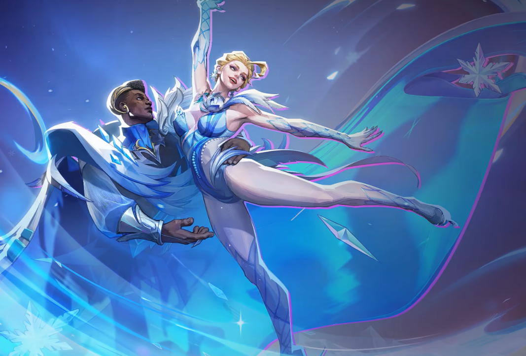 皮肤外观:这套皮肤不仅是对外观的彻底重塑,更在视觉上讲述了一个关于默契与共舞的故事。正如官方所述:“让光与影在冰面上交织出一段圆舞曲。” 它强调的是一种战斗中的和谐与优雅姿态,为激烈的对战注入了一抹静谧而华丽的冬日诗意。