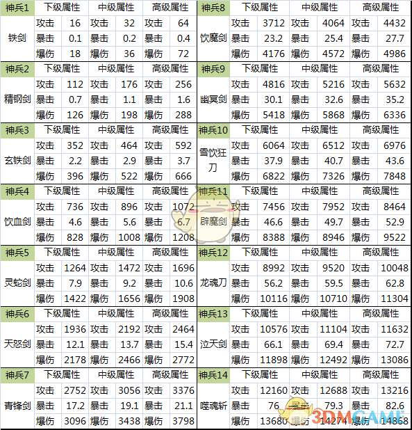 以下是《武林争霸》神兵属性详细数值,还请各位少侠多多熟悉,掌握神兵的秘诀!(神兵的暴击是以百分比计算)