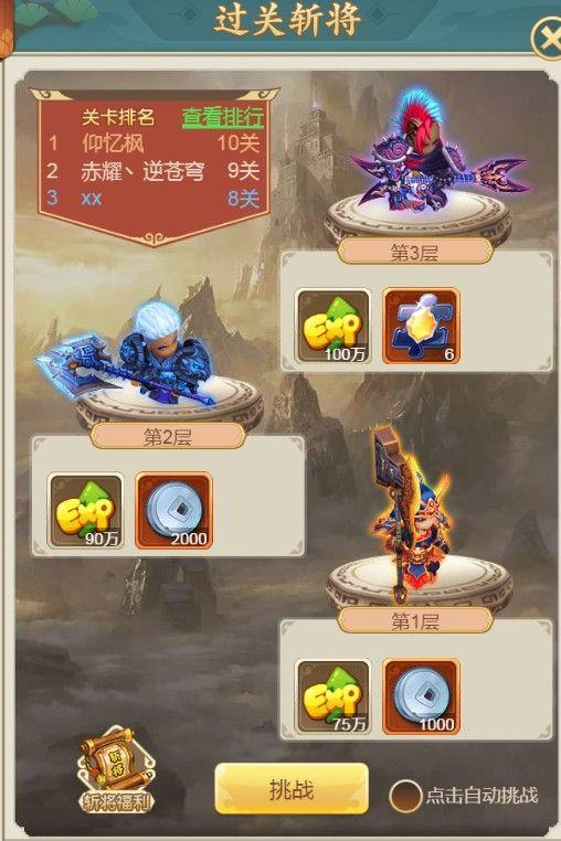 最后就是过关斩将,这个呢就好比是个爬塔的游戏,从第一层慢慢往上面打,然后经验也是越来越多的,但是难度也会是越来越多,的毕竟是一个爬塔的游戏,难度肯定就不用说,战斗力足够可以去挑战。