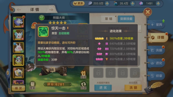 1、必杀技:必杀技惊天一击,挥动大棒跃向指定区域,对目标内区域造成560%的物理伤害,并有80%几率使目标陷入2秒眩晕,技能冷却时间30秒。