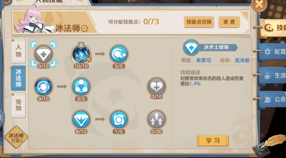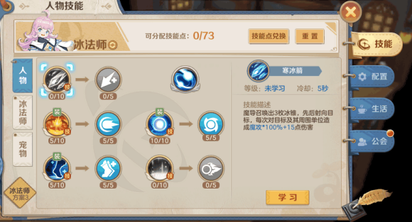 冰法师栏中暴风雪、寒冰宝珠进阶、霜冷刺骨都尽量在5+5的基础上加满。生命属性部分则随意。