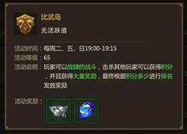 在每周二、五、日19:00-19:15分可开启比武岛活动,在活动中玩家进行战斗获得积分,当活动结束以后根据积分排名获得奖励,排名越高奖励越好。