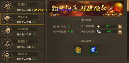 首先点击【活动大厅】中的精炼副本选择进入,旋即会被传送到本国材料副本NPC面前,选择精炼副本。下面可以让我们选择快速完成,快速完成需要等级达到70级或者自身VIP等级为2。在副本内击杀30只怪物即可完成通关获得十颗精炼石,也可选择双倍获取奖励,但需要玩家属于VIP才能领取。