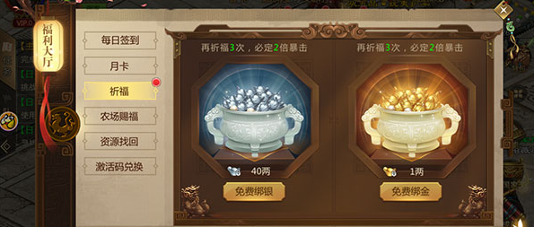 首先玩家们点击界面中的【福利】按钮进入,再点击左边选项卡中的【祈福】就可以进入祈福界面进行绑金绑银的暴击获得了,玩家们需要注意的是祈福活动是需要人物等级到达75级才可以在福利中看见的。