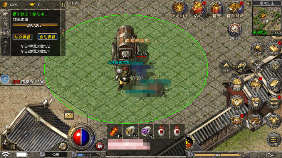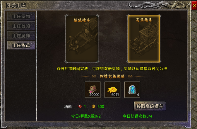 高级镖车押运需要消耗500传奇币和1个卧龙镖令,押运完成奖励(单倍):20000功勋、60万金币、4个生命之息