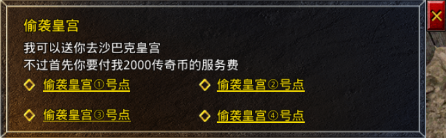进攻方可以通盟重老兵前往影之道直接花费2000传奇币偷袭皇宫,偷袭皇宫有4个点可以选择进,分别对应着皇宫里东南西北四个角落,需要注意的是影之道里是可以使用召唤令的,可以直接召唤帮会里的兄弟进去偷袭皇宫。
