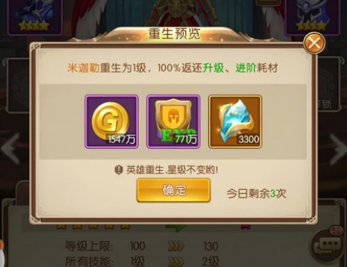 重生英雄之后能够100%返还所打造他用的材料,用了多少经验,金币,进阶石,都会全部返还,但是需要注意的是,重生功能每天能够免费使用3次,3次用完之后,后续要接着重生就需要花费钻石了。