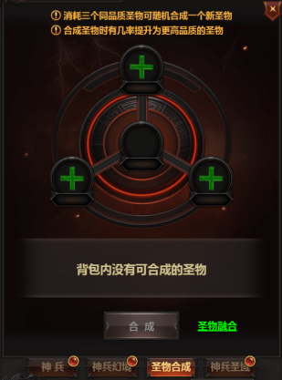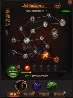 神兵等级解锁的同时也能解锁神兵圣物的槽,神兵圣物主要用来增加面板属性和自带提升一级强化增益。也就是上图中变色的部分。但这里笔者要说的是,圣物带来的强化点是不计算在解锁下阶强化点中的。另外,多余的圣物也可用来圣物合成,让资源更有效的利用。