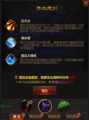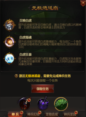 雷霆怒斩(战士)、赤血魔剑(法师)、无极逍遥扇(道士)每个神兵各分为5个任务解锁,难度要求不高跟随指引即可。