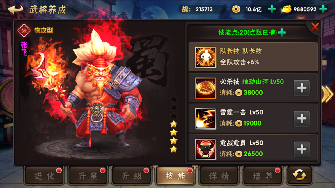 武将技能升级需要金币和技能点,每升级一次需要1点,最高不超过武将当前等级。技能点每10分钟回复10点,最大储存量20点,日常玩耍的时候不要忘了时不时进去加点。如果购买了30元的便捷福利礼包,最大储存量将加到999,升级技能就非常快捷了。
