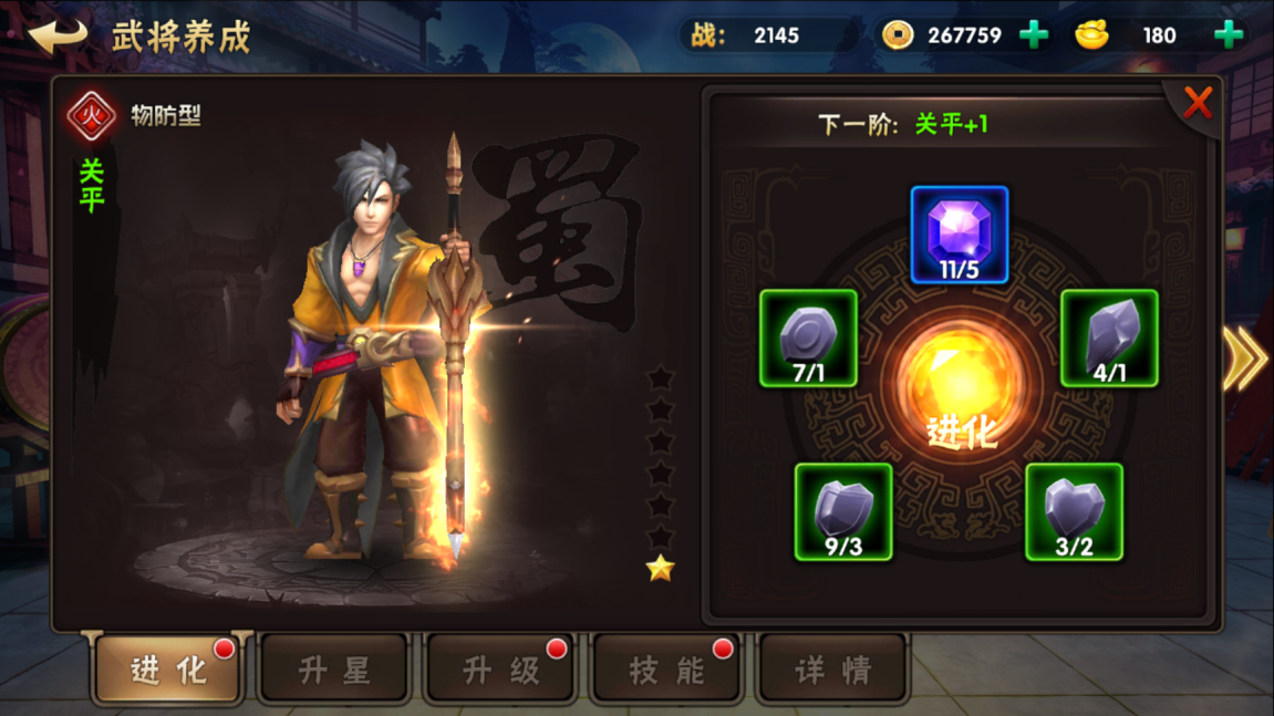 武将进化可以提高武将的品质,从而提升战力。越高级的品质,所需要的玉石等级也越高,进阶石和玉石的消耗数量也会越多,获取途径通过关卡获得,越难的剧情关卡和挑战关卡获得的玉石品质越好,扫荡可以快速获得进化材料。