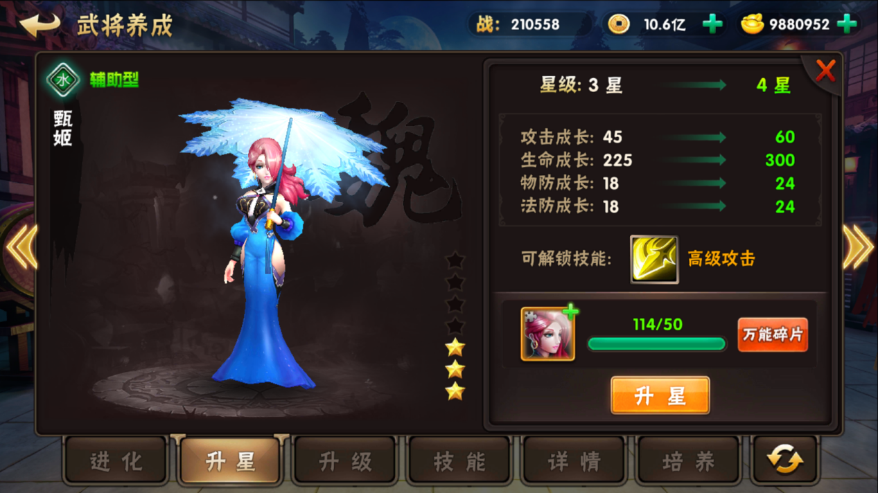 提升武将星数,武将星数增加,武将的属性成长将大幅提升,还可以解锁更多新的技能,需要武将碎片,可以使用万能碎片转化。除不定时活动有时大量提供某种武将的碎片外,平时还可以通过酒馆招募获取,或在神秘商店、竞技商店、王朝商店等商店中通过金币、声望、俸禄等资源购买,部分武将也能够在精英关卡扫荡获得。