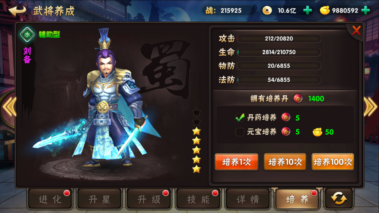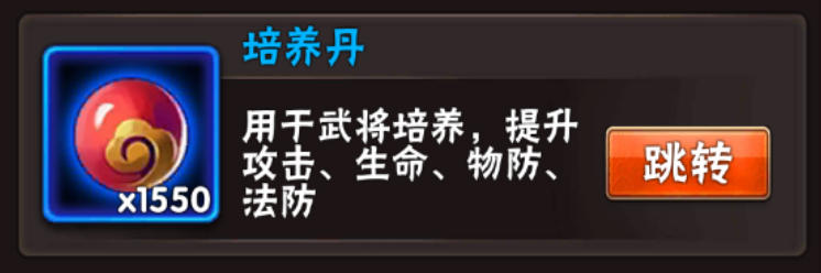 可在武将养成界面用于武将培养,会在四项属性中随机上升或下降,可以只选择对自己有用的培养结果固定,提升武将战斗力。培养丹在斗技场积分奖励中获得,也可以通过押镖增加。