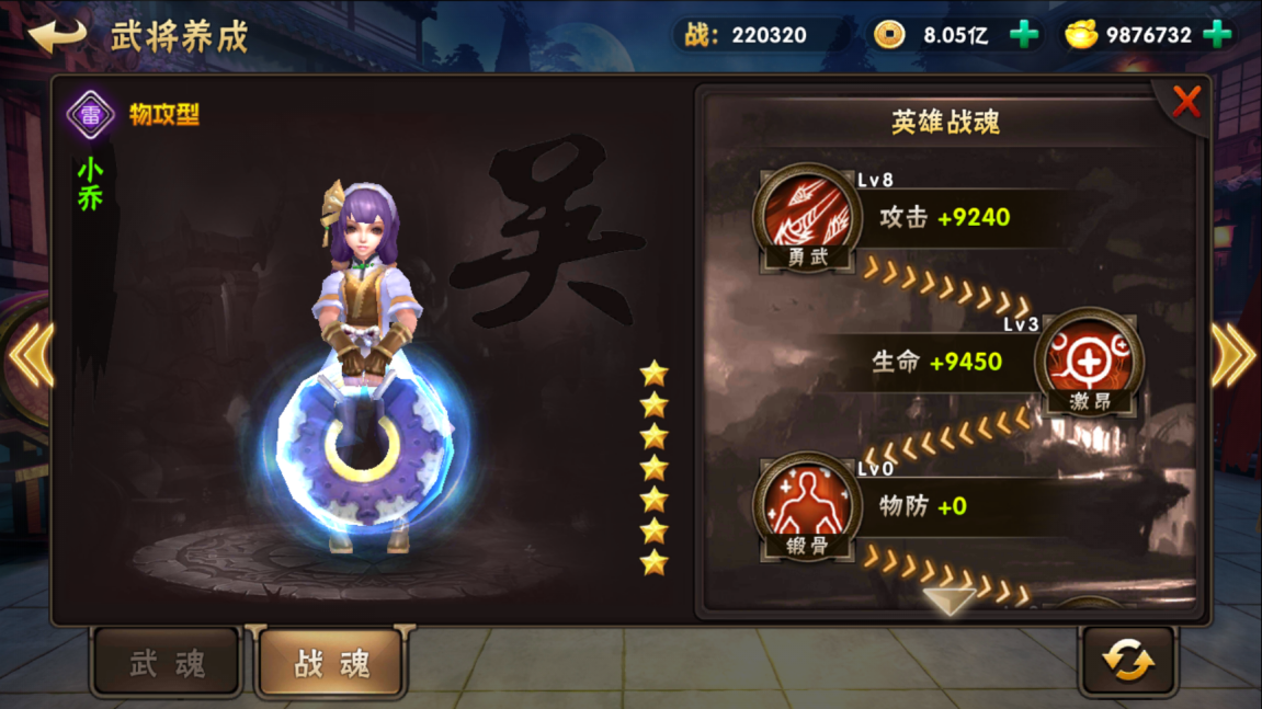 武将达到5星后会解锁战魂,星越高可强化的战魂种类越多,包含基础属性加成和百分比属性加成,不用等前项升满再升后项,而是可以自由选择升级,来根据武将定位进行更合适的加点,魂晶主要通过名人堂玩法获得。