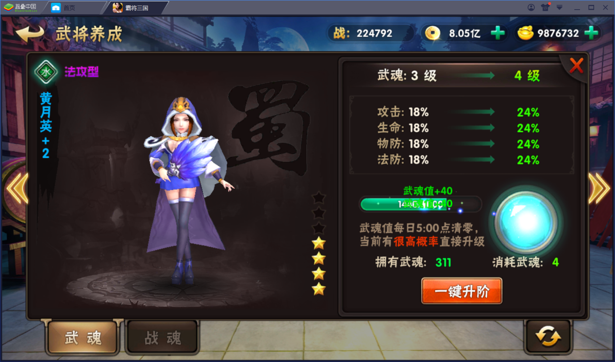 武魂的提升要求也比较苛刻——当天如果不一次性将武魂等级提升一级,那么当前武魂提升的进度将会被清零。请准备至少达到一键升阶数量8成数量的武魂再开始。
