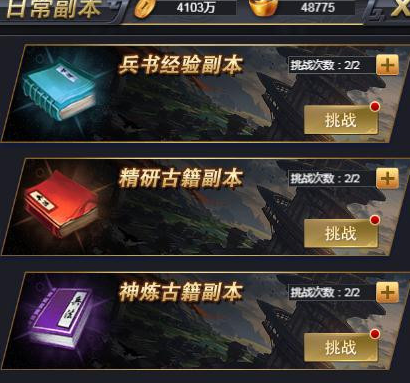 比如说需要兵书升级所需兵法经验书在兵法经验副本中获得。兵书精研所需的精研古籍在精研古籍副本中获得,兵书神炼所需的神炼古籍在神炼古籍副本中获得。