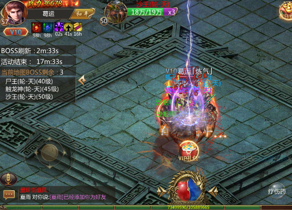 六道共计18个BOSS,30级以上的玩家可以参加,杀死BOSS获得丰厚的奖励,15分钟后将刷新出下一批BOSS,请玩家注意好时间。