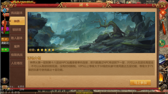 神界每次进入需要消耗一个神魔令,神魔令不足时,可以直接花费少量元宝即可进入。共有十八层,每提升一层获取的经验与怪物的难度都会等价提升,每一层都由NPC仙魔使者单向连接,也就是要想继续往下一层前进,就只能通过魔仙使者传送至下一层。前往下一层的路是趟单程票,只可以从底层前往高层,不可折返从高层回到低层,所以难度只会不断提升,需要好好拿捏自己角色的实力。在副本中没有时间限制。