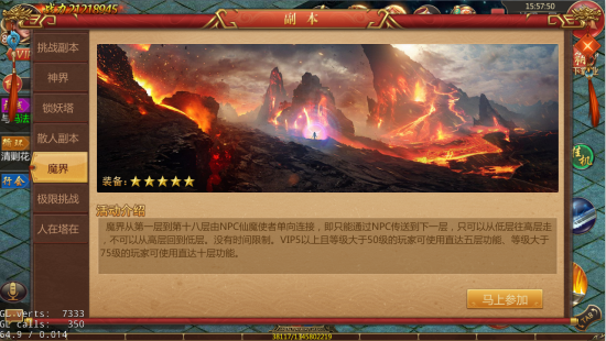 魔界与神界相同,每次进入需要消耗一个神魔令,神魔令不足时,可以直接花费少量元宝即可进入。一共十八层,与神界不同之处在于,魔界埋藏了大量极品装备。每提升一层能够获取的装备品质越高。每一层都由NPC仙魔使者单向连接,和神界相同,只能向前不能往后退,随着层数的提升,挑战难度也会相应提升,需要玩家们好好把控自己的实力。