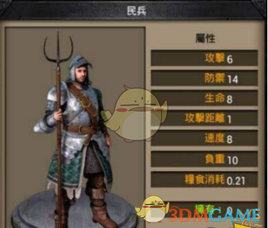 民兵这一个兵种是游戏中最初级的兵种之一,这一个兵种的防御属性和生命属性不错,另外在战斗中也可以利用自身的速度和攻击对敌方的单位造成不俗的伤害。最重要的是这一个兵种拥有盾牌这一个技能,可以减少来自弓兵和弩兵的伤害,还拥有体魄技能,可以让自身的生命值大幅度的提升,铁甲这一个技能可以让民兵的防御能力大幅度的提升。