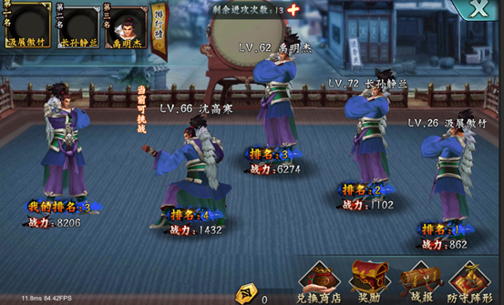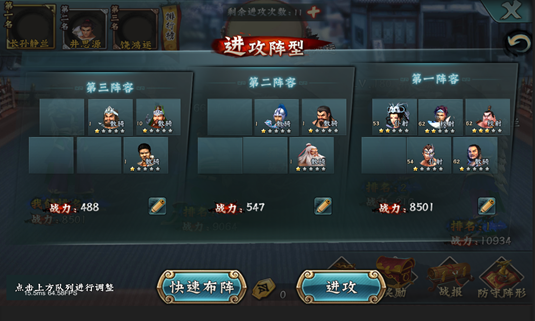 2)两局三胜(玩家拥有的武将分为三个阵容进行战斗,通过三局两胜的方式决定胜负,异步交互玩法)