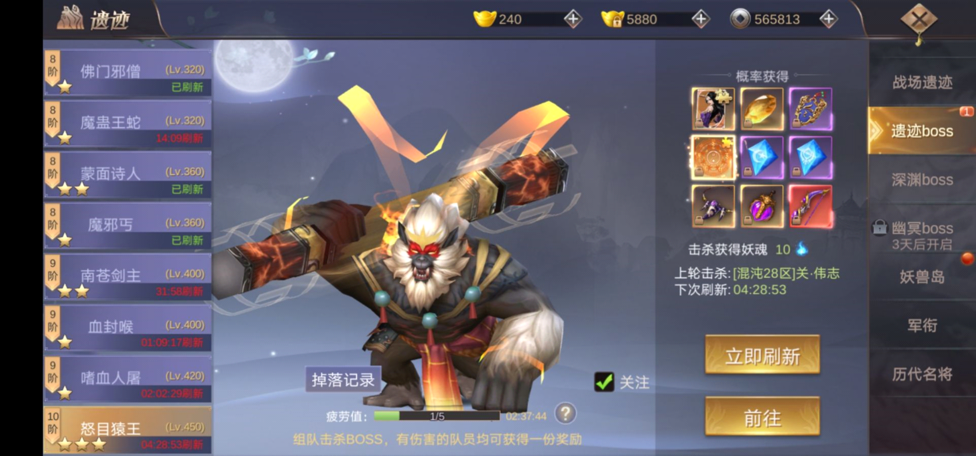 还有一个比较神秘的,幽冥boss(开服快两个月了,还有三天才能开启)以前偷渡进去过,但现在进不去,幽冥boss主要掉落,九阶三星装备,打一个boss 100%掉落九阶三星,或者更高,以及还有一些圣品装备石,皇品装备石之类的,幽冥boss也是有疲劳值的,具体多少还不太清楚,有待补充。