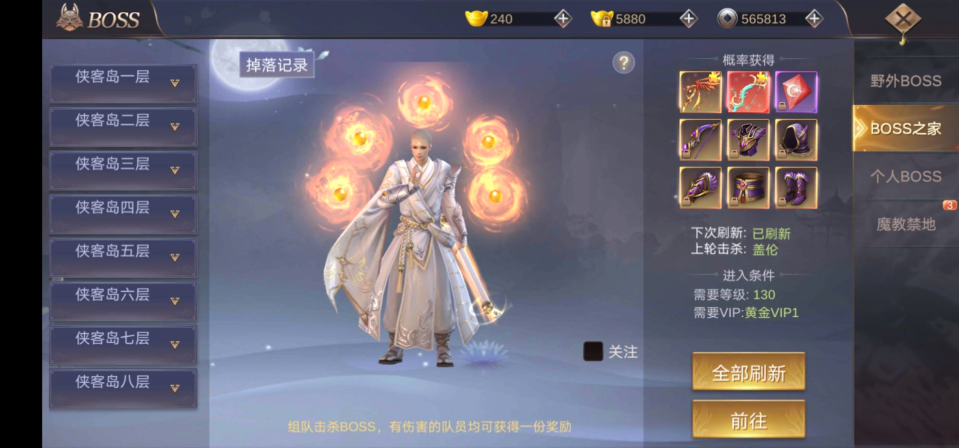 个人boss:贵族等级越高,挑战次数越多,进入一次要240绑元,对应等级可击杀对应的boss,每天有挑战次数限制(我自己Ⅴ6,3次,更高就不知道了,有望大佬补充)个人boss主要掉落:光环左灵石,光环右灵石,光环精华,以及角色装备和光环碎片