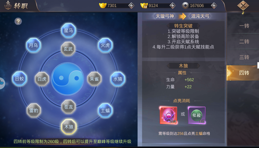 250级后四转突破,需要点亮命格,消耗天命魂石(元宝商城购买)或者经验即可。