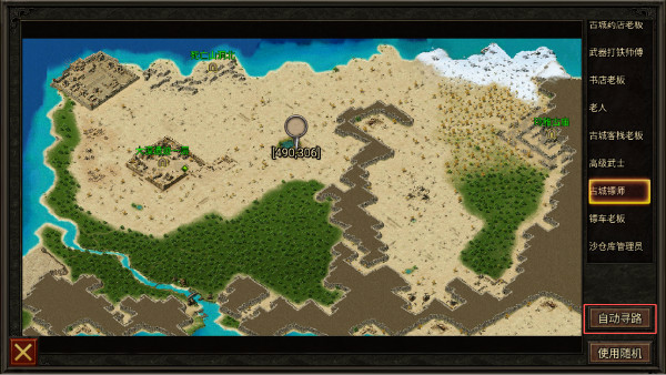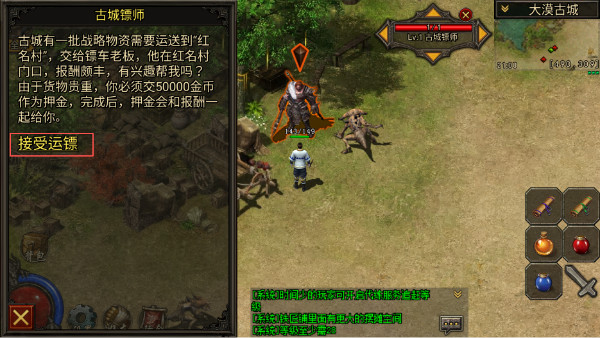 4.勇士们到了28级之后就可以在古城镖师NPC(坐标490,306)处去领取押镖任务,新人不知道在哪里的可以点开右上角大地图,在右边NPC栏里面滑动找到古城镖师点击自动寻路。